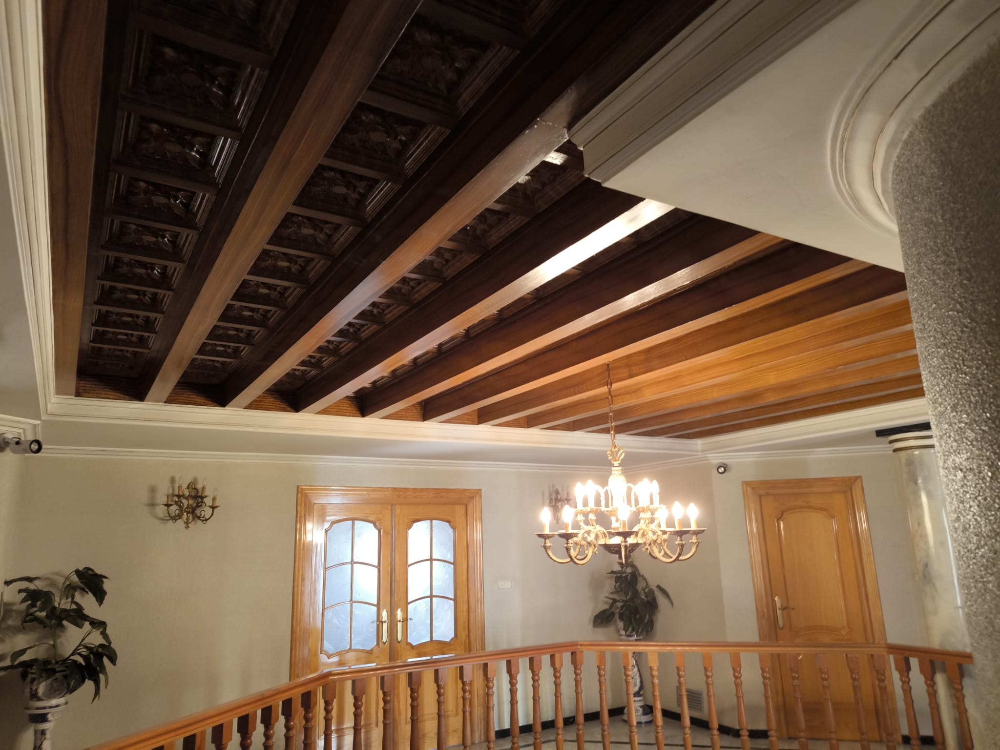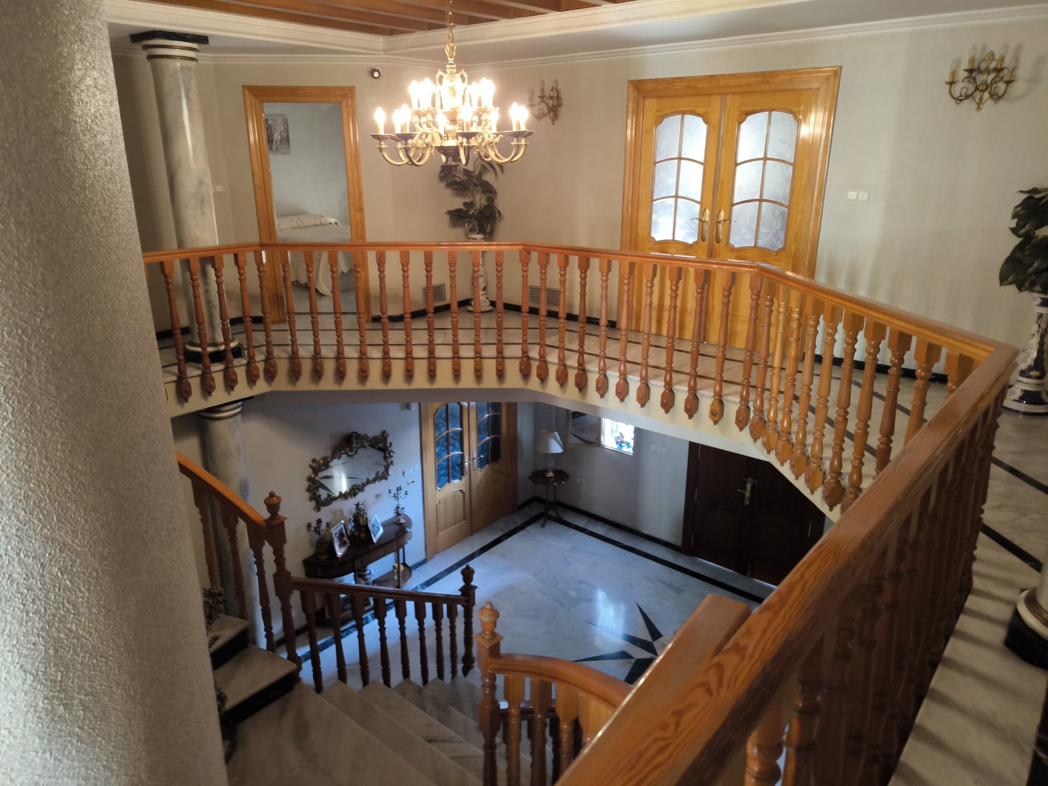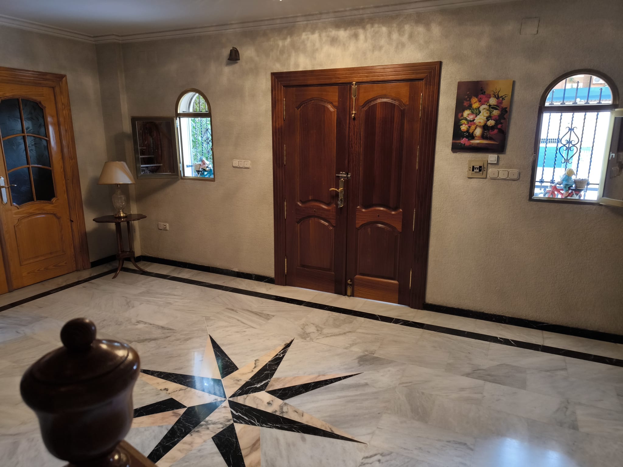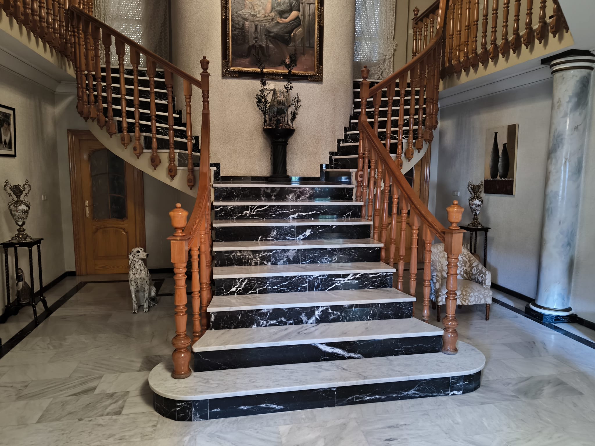 Planta baja: amplio vestíbulo con elegante doble escalinata, gran salón‑comedor dividido en 2 ambientes, despacho o cuarto de plancha, acogedora sala con chimenea, cocina independiente, lavadero y baño completo.