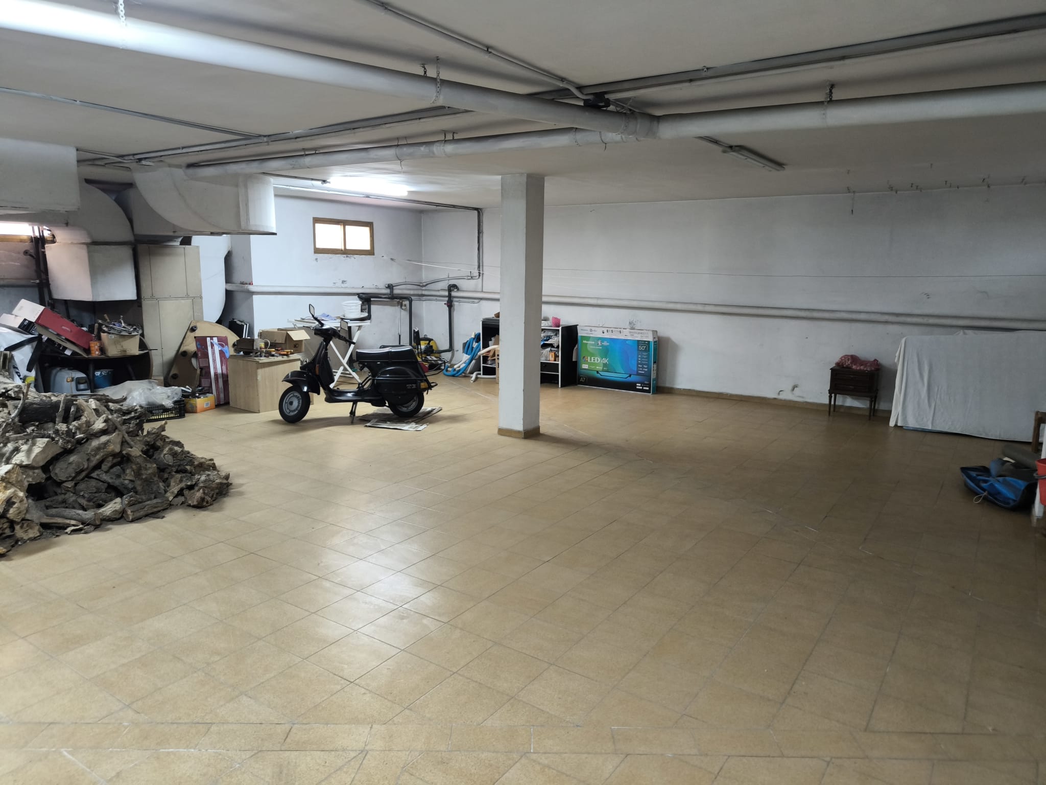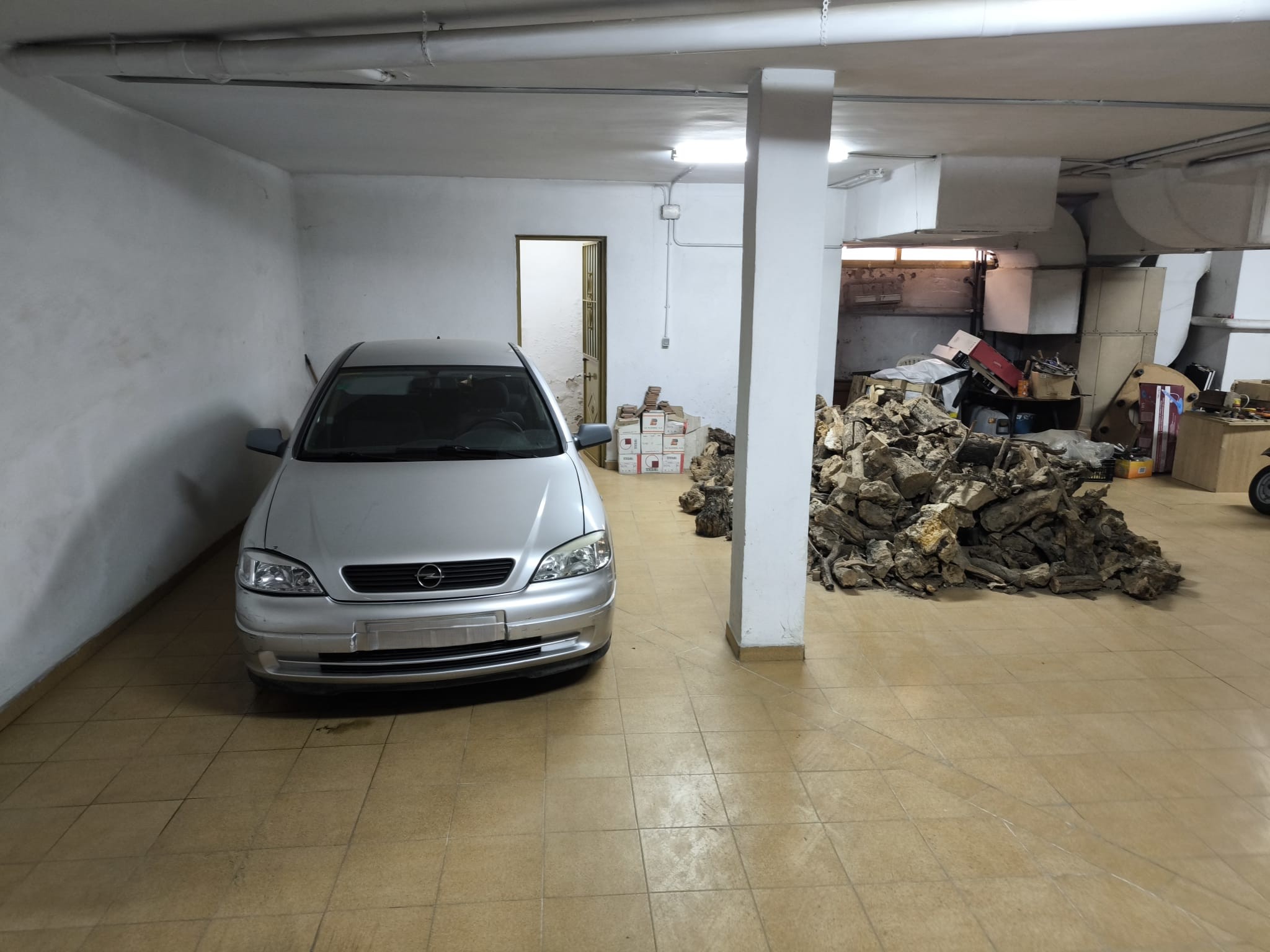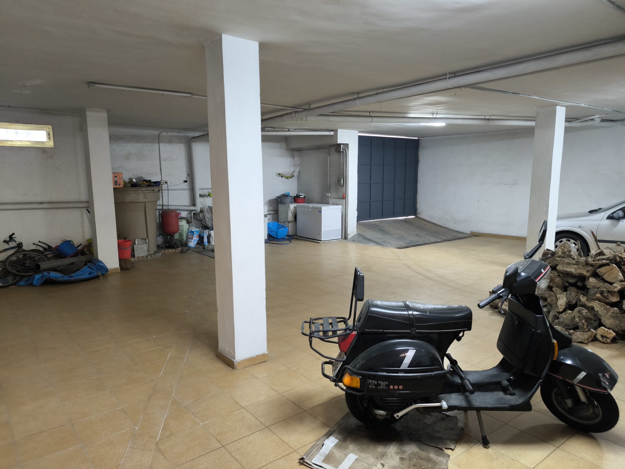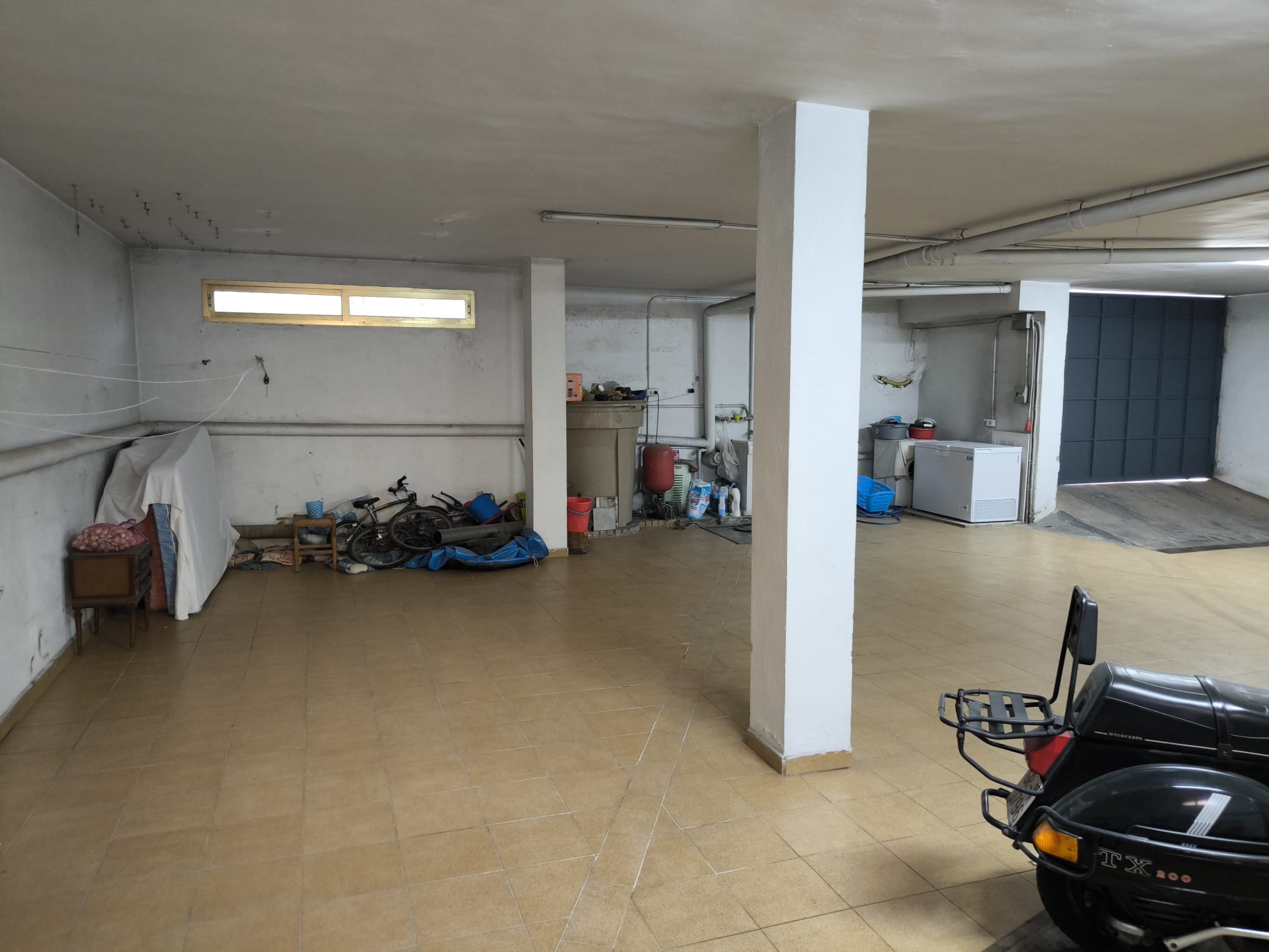 Planta semisótano: gran espacio diáfano de 142 m², con acceso interior mediante escalera de caracol de madera, actualmente utilizado como garaje y trastero.