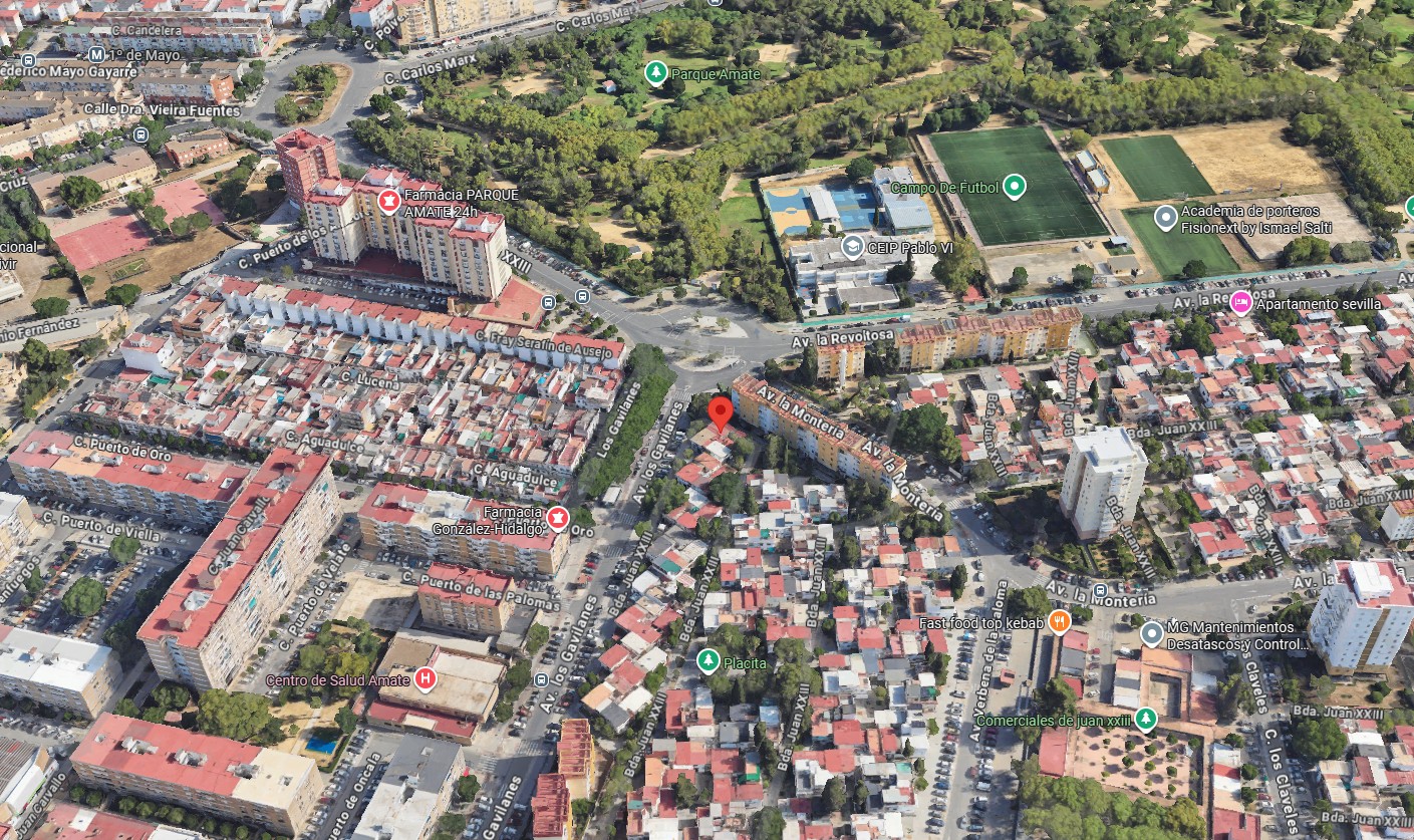 Está ubicada en la Barriada Juan XXIII nº 16, una zona residencial consolidada del distrito Cerro‑Amate, con comercios de proximidad, supermercados, colegios, zonas verdes y todos los servicios esenciales a pocos minutos caminando. Se encuentra junto al Parque Amate y al CEIP Pablo VI, lo que aporta un entorno cómodo y funcional para la vida diaria. Bien conectada con el centro de Sevilla y con los principales puntos de la ciudad, ideal como vivienda habitual o como inversión.