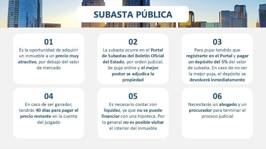 La subasta ocurre en el Portal de Subastas del Boletín Oficial del Estado, por orden judicial. Se puja online y el mejor postor se adjudica la propiedad.